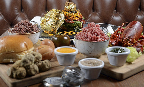 Αυτό, γιατί περιλαμβάνει φύλλα χρυσού, ο μπιφτέκι του αποτελείται από 220 γραμμάρια βοδινού κιμά, 60 γραμμάτια ελαφιού Νέας Ζηλανδίας, έχει αλατιστεί με καπνιστό αλάτι Ιμαλαΐων και έχει εμποτιστεί με υγρό μαύρης τρούφας.